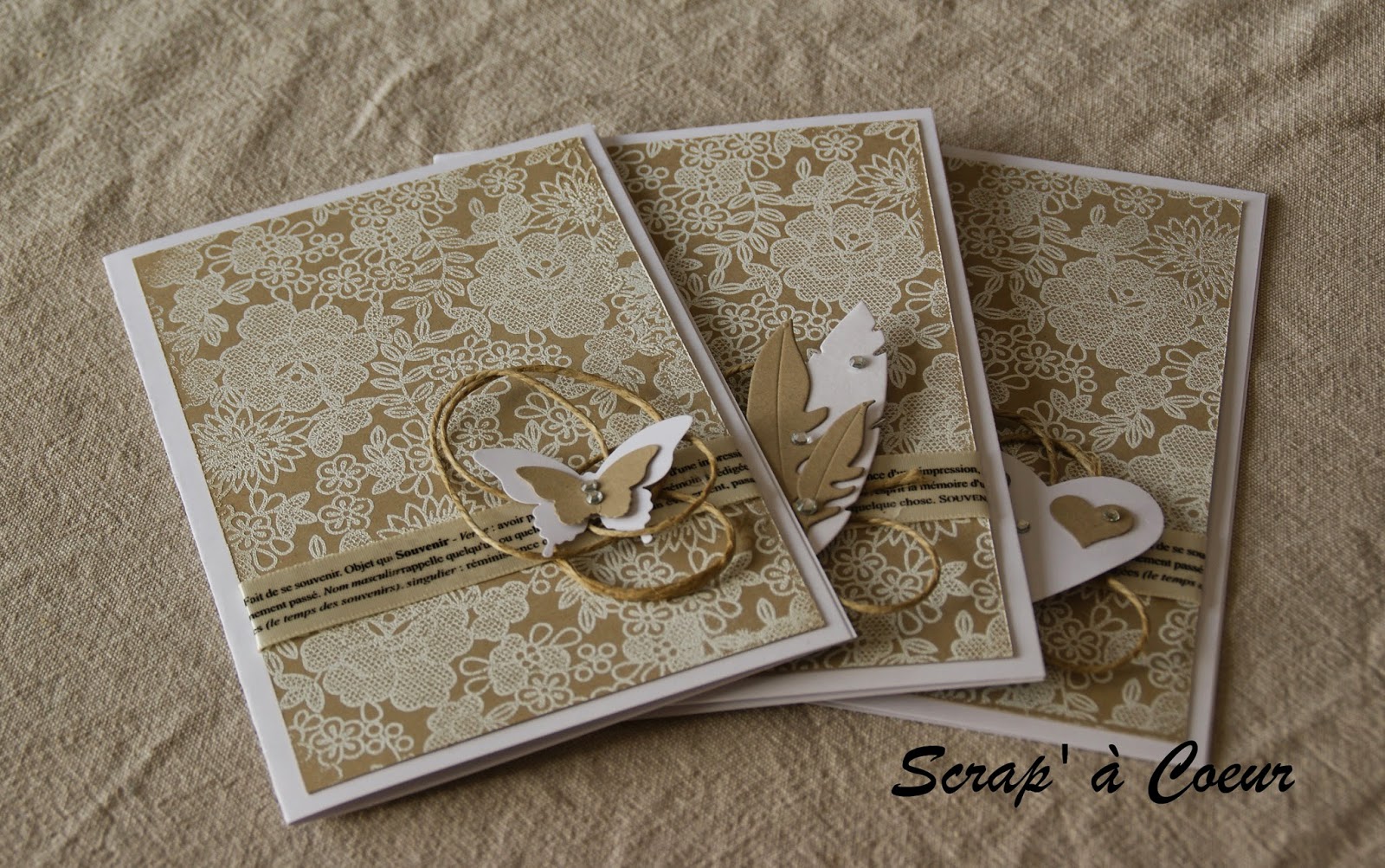Pour les 4 premières, j'ai utilisé une petite nouveauté du catalogue printemps/été, le tampon de fond "something lacy" (en p.43). Les détails ultra fins de son motif permettent l'embossage à chaud et comme par magie, une magnifique dentelle apparaît sur le papier !!